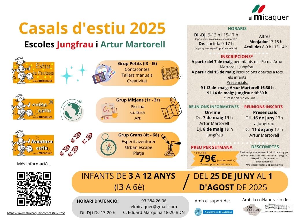 Us adjuntem la presentació de la reunió amb la informació bàsica dels casals: Informació casal d’estiu Artur Martorell i Jungfrau 2025